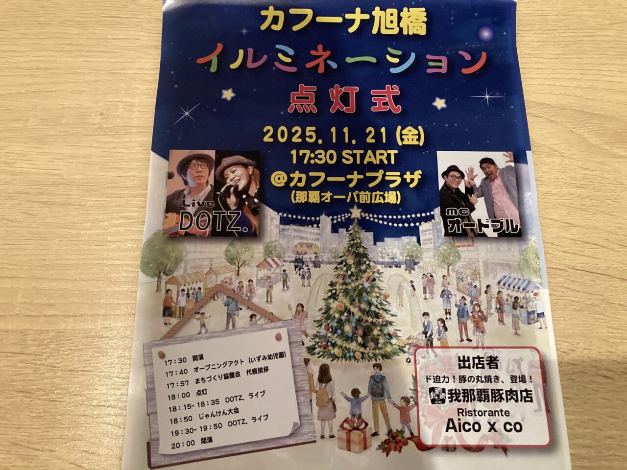 那覇オーパを含む複合施設「カフーナ旭橋那覇オーパ前広場(カフーナプラザ)」で、「イルミネーション点灯式」を祝うイベントが開催されます!地域住民やオフィス帰りに来訪者が気軽に楽しめる無料のイベントです。イルミネーションの点灯を盛り上げるため、様々な企画が予定されています。