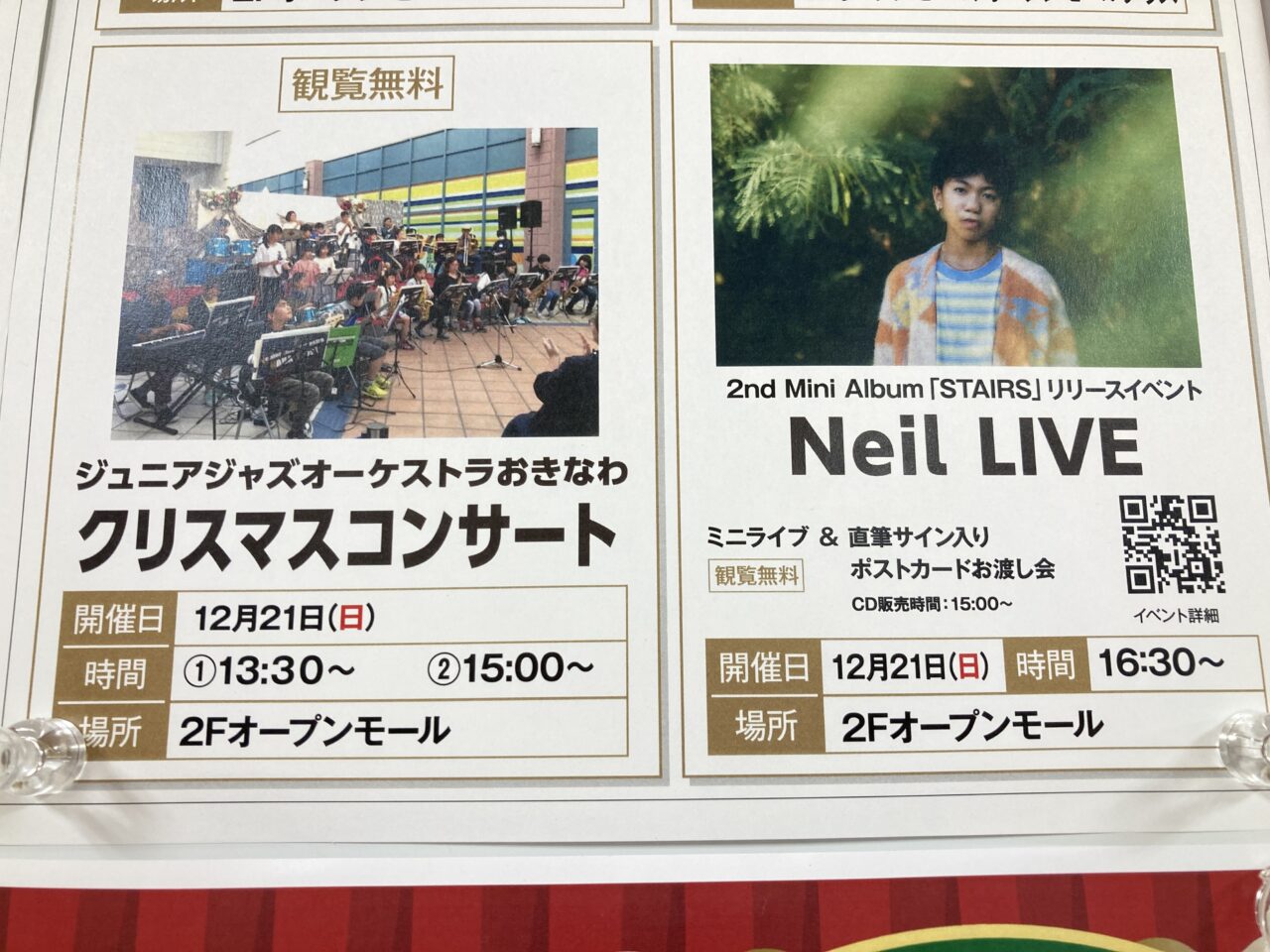 サンエー那覇メインプレイス2Fオープンモールにて、ジュニアジャズオーケストラおきなわによる無料のクリスマスコンサートが「ジュニアジャズオーケストラおきなわクリスマスコンサート」とアーティストNeilさんの2nd Mini Album「STAIRS」のリリースを記念したミニライブが開催されます。