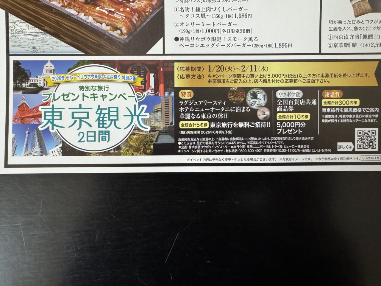 さらに、今回は見逃せないビッグチャンスがあります!「特別企画 東京旅行プレゼントキャンペーン」が同時開催されており、会場でのお買い物5,000円以上の方には応募用紙が与えられ応募箱へ投函いただいた中から抽選となります。これをきっかけに、東京への旅が当たるかもしれません♪美味しいものを食べて、次の旅の夢も膨らむ、まさに一石二鳥の贅沢なイベントです!
