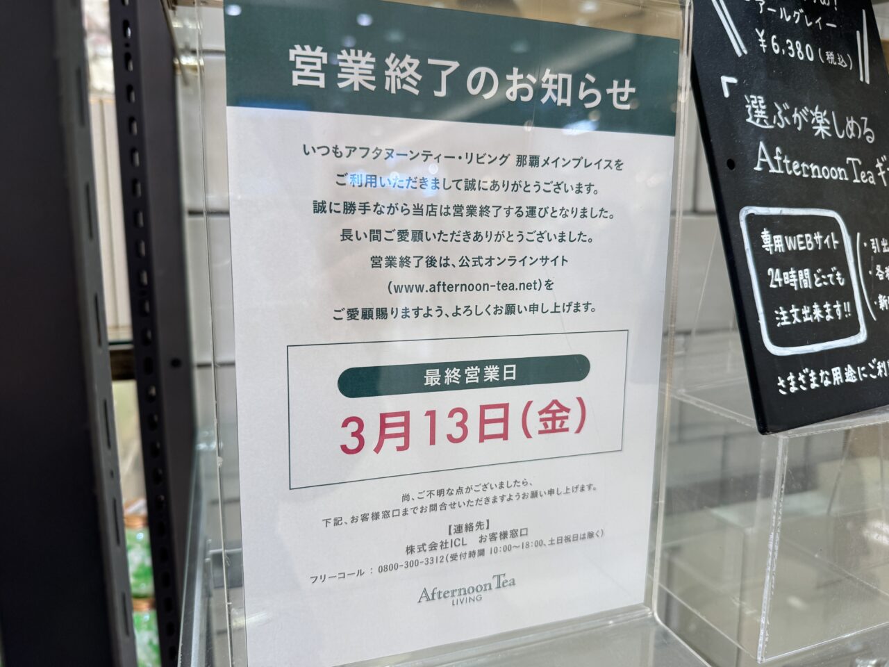 那覇のショッピングシーンを彩ってきた人気雑貨店の、突然の悲しいニュースが入ってきました。サンエー那覇メインプレイス1階で、多くのファンに愛されてきた「Afternoon Tea LIVING(アフタヌーンティー・リビング)サンエー那覇メインプレイス」が、2026年3月13日(金)をもって営業を終了することがわかりました。