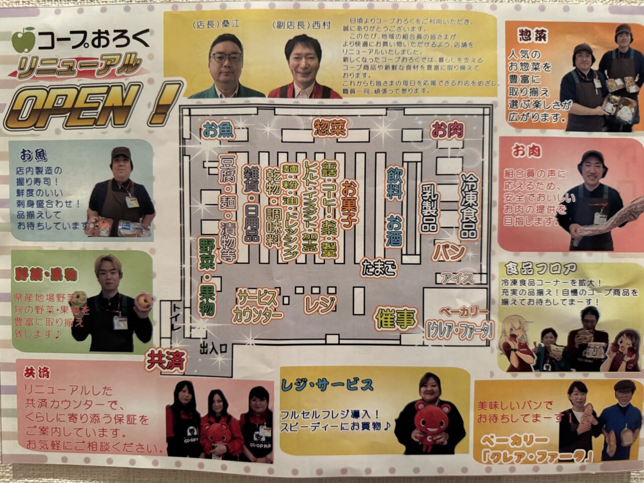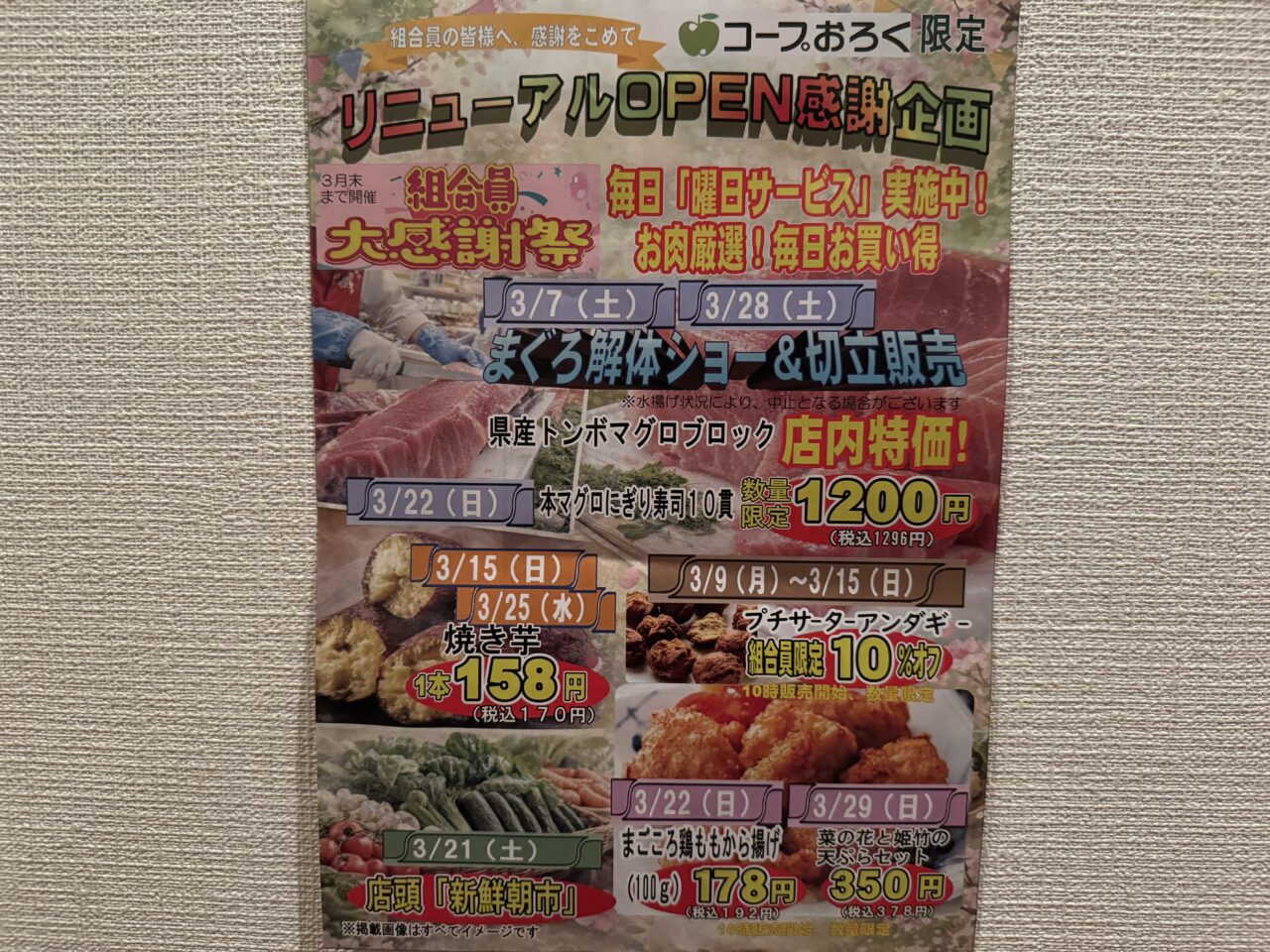 また、3月22日(日)には「本マグロにぎり寿司10貫」が1,200円(税込1,296円)で数量限定販売されるなど、鮮魚コーナーの熱気は見逃せません!加えて、毎日開催の「曜日サービス」では、厳選されたお肉などがさらにお買い得になっています♪日々の食卓を支える地域のスーパーとして、より買い回りやすく、活気あふれる空間へと進化した「コープおろく」。休業期間を経てパワーアップし、感謝企画イベントも行われる新しくなったお店で、楽しみながらできるお買い物をしてみてください♪