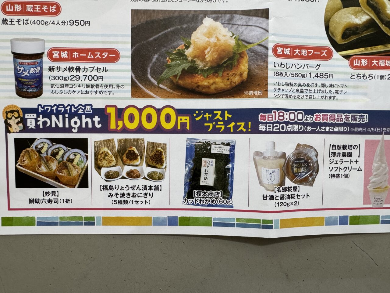 毎日18:00からは、1,000円ポッキリでお得な商品が手に入るタイムセール「買わNight」も開催されています(限定20点、最終日除く)。