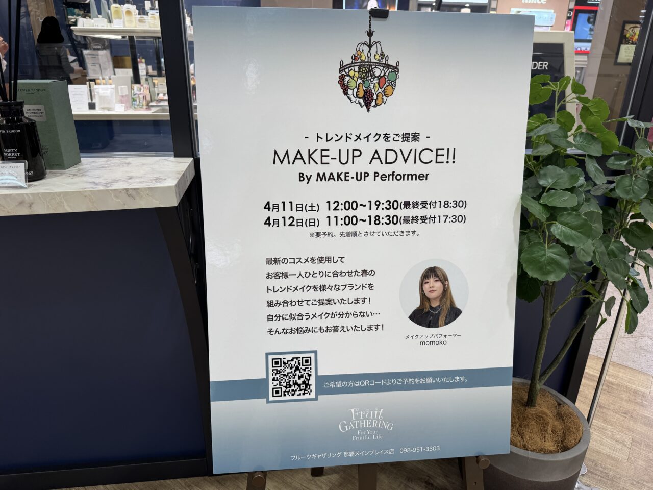 2026年4月11日(土)・12日(日)の2日間、那覇メインプレイス内の人気ショップ「フルーツギャザリング」にて、メイクアップパフォーマーによる「-トレンドメイク提案会-MAKE-UP ADVICE!!」が開催されます。