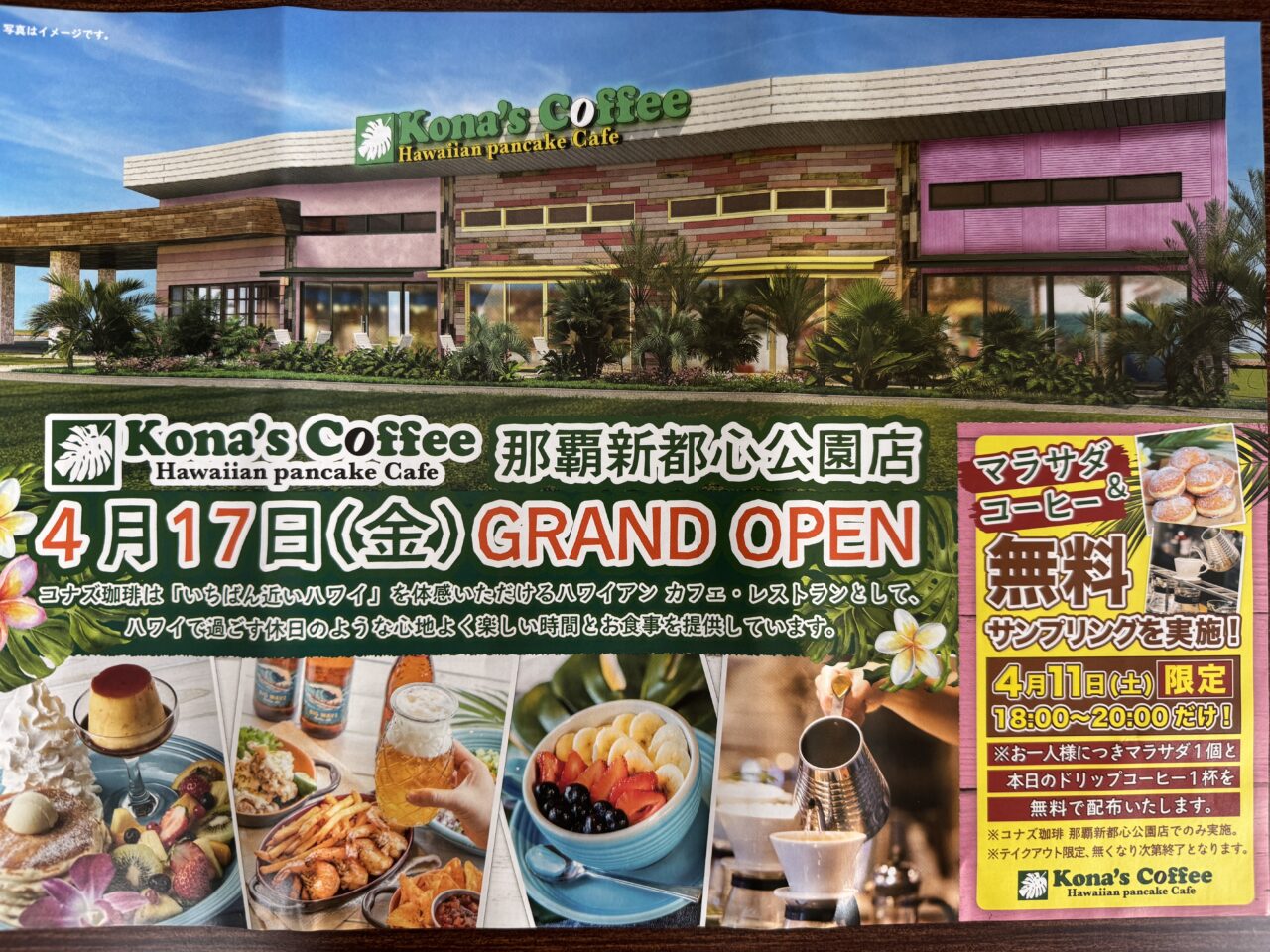 2026年4月17日(金)のグランドオープンに先駆け、4月11日(土)に、一夜限りの特別なサンプリングイベントが開催されることがわかりました。那覇新都心公園内に誕生する「コナズ珈琲 那覇新都心公園店」。 オープンを心待ちにしている方も多い中、4月11日(土)18:00〜20:00限定で、一足早く自慢のコーヒーだけでなくハワイアンスイーツの定番「マラサダ」も味わえる「FREE SAMPLING(無料サンプリング)」が実施されます♪マラサダと淹れたての香ばしいハワイアンコーヒーとの相性は抜群ですよね!そんな素敵な企画が用意されているとは楽しみです♪公園の爽やかな風を感じながら、この最強コンビを無料で楽しめるのは、オープン前の今だけの特別な機会です!